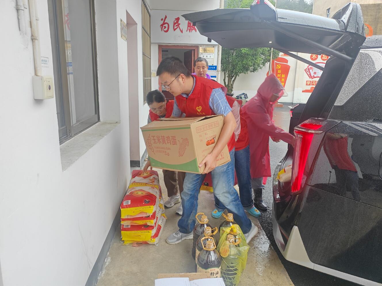 上圖為:采購米、油和雞蛋等生活急需物資送到上豐鄉災民安置點(diǎn)